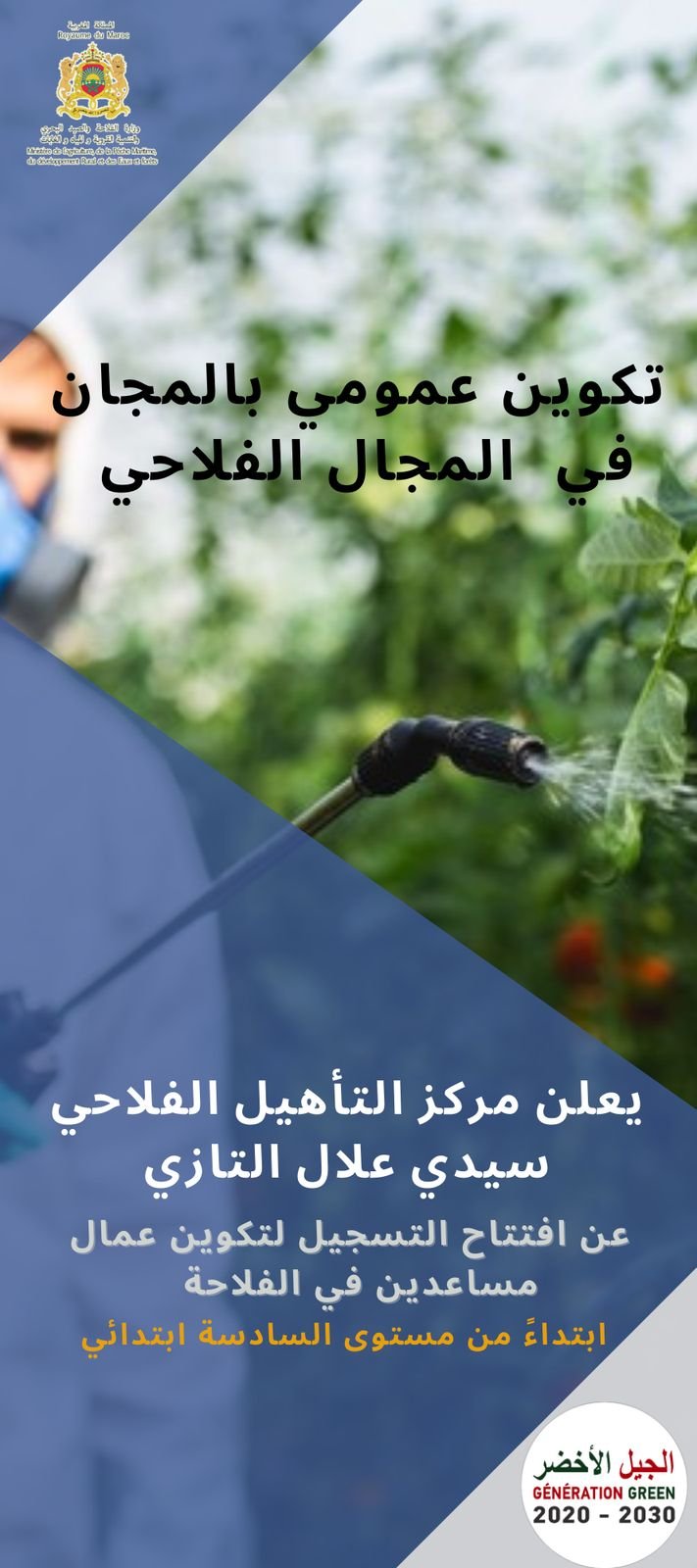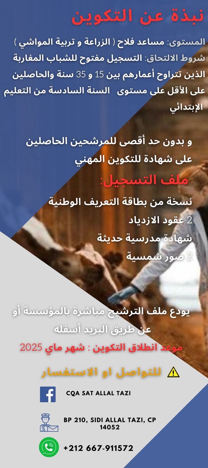 أعلن مركز التأهيل الفلاحي بسيدي علال التازي عن فتح باب التسجيل برسم سنة 2025. لتكوين مساعدين فلاحيين في مجالات الزراعة وتربية المواشي. في إطار تكوين عمومي ومجاني يندرج ضمن أهداف استراتيجية “الجيل الأخضر 2020-2030”.